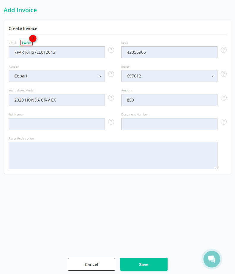 Note: By clicking the “Search” button at the top of the “VIN” field (Figure 5, Pointer 1), the fields “Lot”, “Auction”, and “Year, Make, Model” will be filled in automatically.