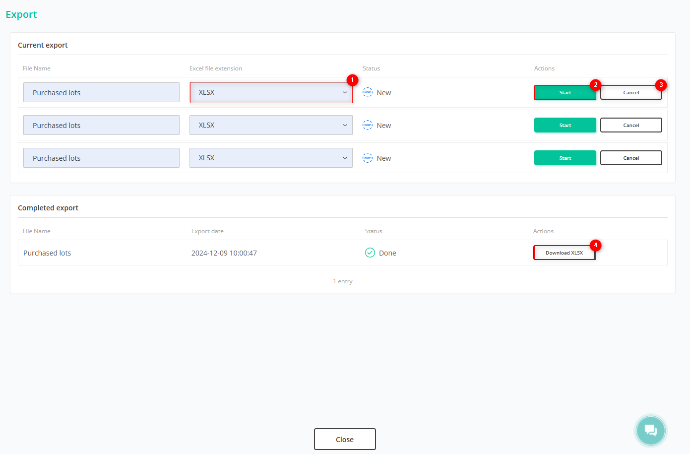 (Figure 1, Pointer 7) opens the export window, where you can download information about the purchased lot. To select the desired format, click the button and choose from the dropdown list (Figure 4, Pointer 1). To download updated information about the lot, click “Start” (Figure 4, Pointer 2). To cancel, click “Cancel” (Figure 4, Pointer 3). To download the completed export in XLSX format, click “Download XLSX” (Figure 4, Pointer 4).