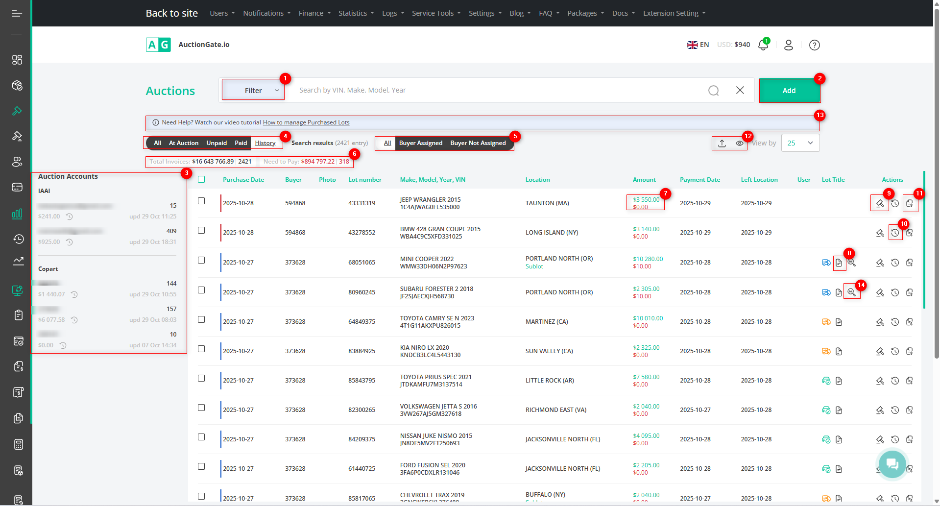 The “Auctions” page is a section that provides information on all vehicles purchased through auction accounts. It displays detailed information for each lot.