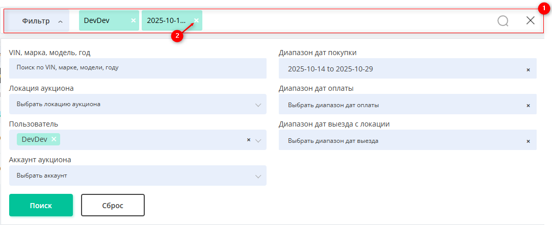 Поисковая строка позволяет проводить поиск по любому параметру (Рисунок 2, Указатель 1). Для этого введите любой запрос и нажмите на кнопку
