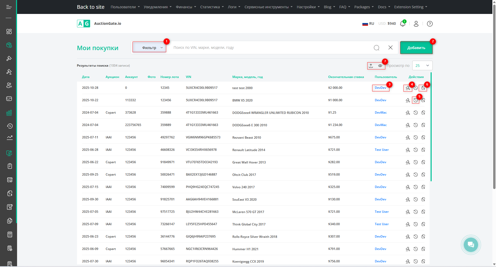 На странице сайта “Мои покупки” расположена строка поиска, фильтр по заданным параметрам, опция добавления лота, а также таблица, в которой отображается весь перечень лотов купленных на аукционе, со всей соответствующей информацией. Это такие данные как: дата, марка,модель,год,аукцион, аккаунт,фото,номер лота, VIN и другие (Рисунок 1).